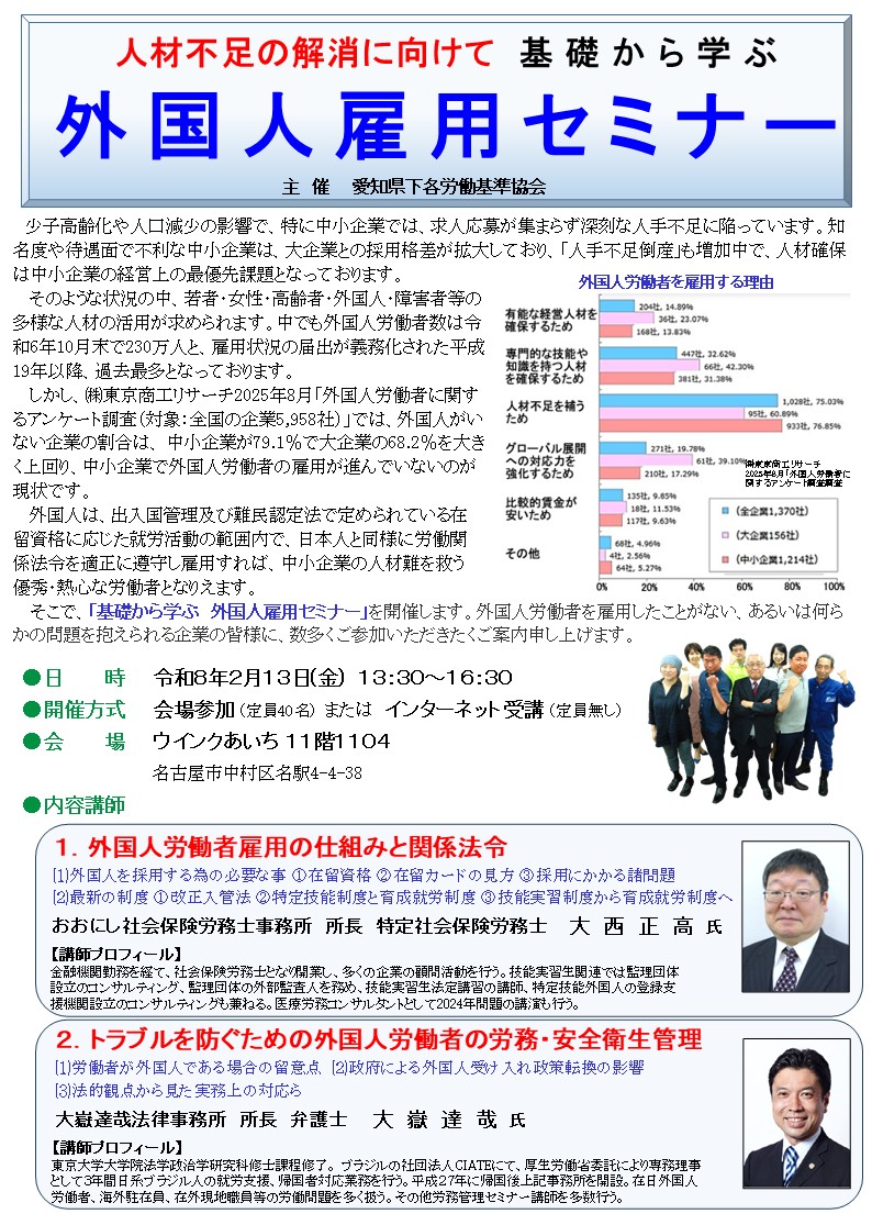 そこで、「基礎から学ぶ 外国人雇用セミナー」を開催します。外国人労働者を雇用したことがない、あるいは何らかの問題を抱えられる企業の皆様に、数多くご参加いただきたくご案内申し上げます。