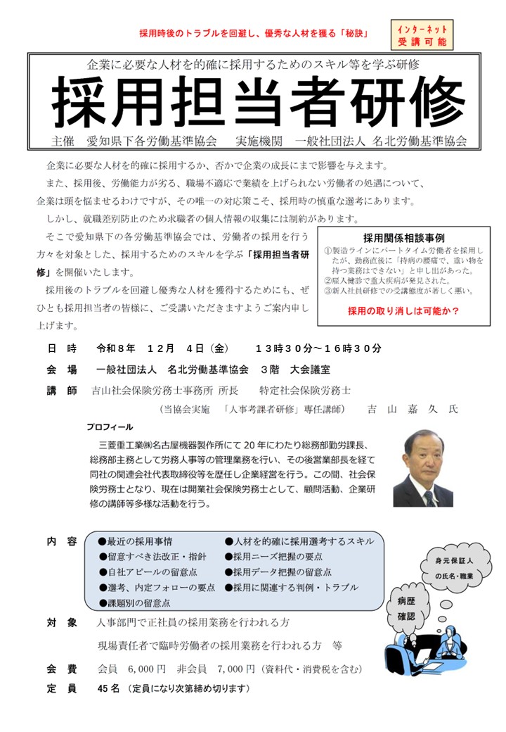 そこで愛知県下の各労働基準協会では、労働者の採用を行われる方々を対象とした、採用するためのスキルを学ぶ「採用担当者研修」を開催いたします。