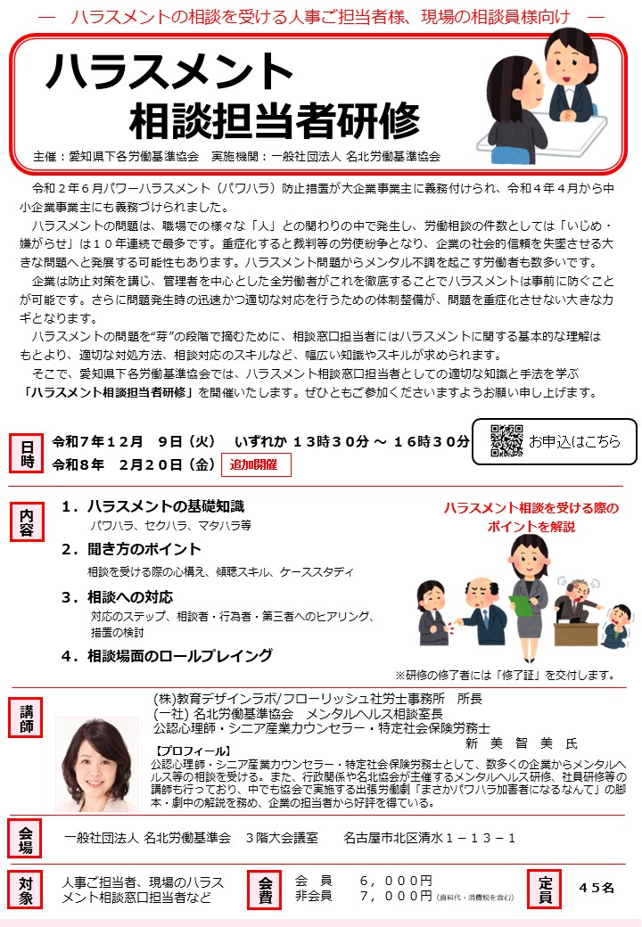 そこで、愛知県下各労働基準協会では、ハラスメント相談窓口担当者としての適切な知識と手法を学ぶ「ハラスメント相談担当者研修」を開催いたします。ぜひともご参加くださいますようお願い申し上げます。
