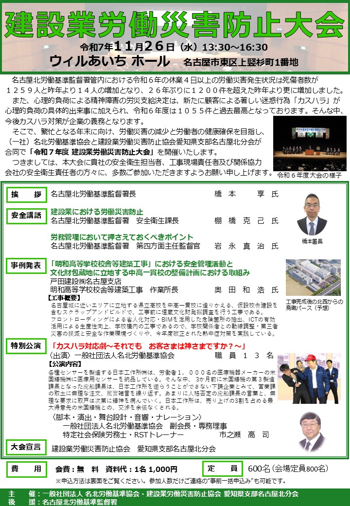 そこで、繁忙となる年末に向け、労働災害の減少と労働者の健康確保を目指し、(一社)名北労働基準協会と建設業労働災害防止協会愛知県支部名古屋北分会が合同で「令和7年度 建設業労働災害防止会」を開催いたします。