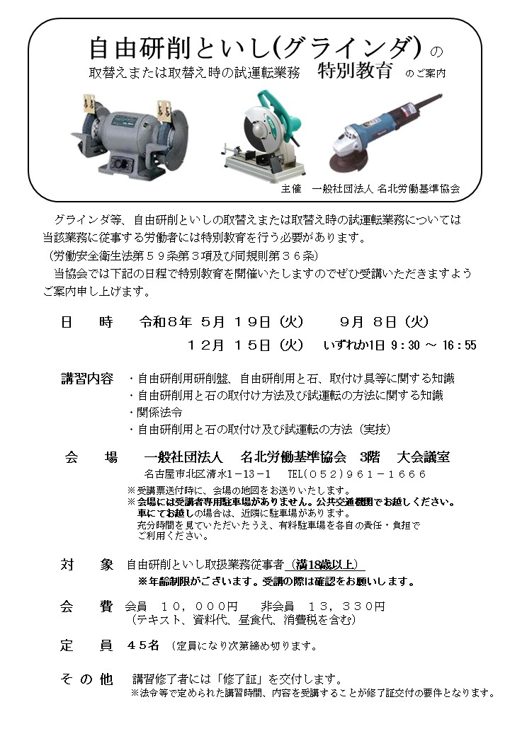 C11 自由研削砥石(グラインダ)取扱者(法定特別教育)講習会開催のご案内