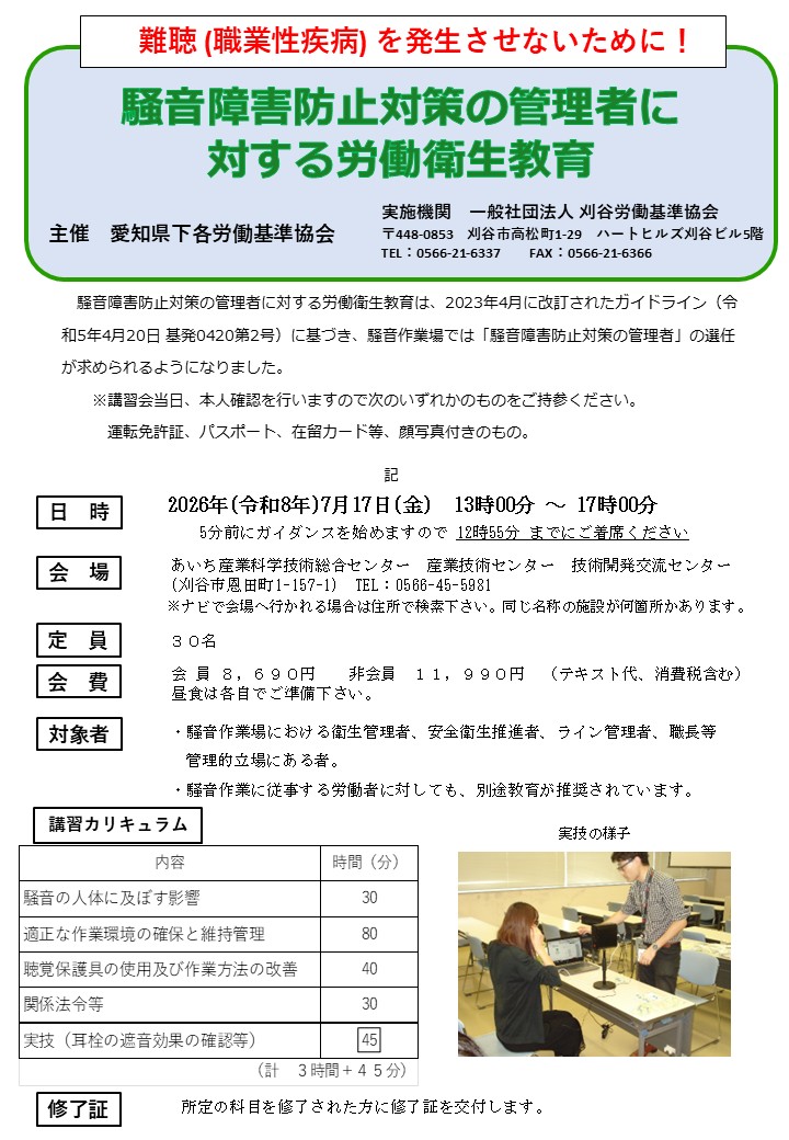 騒音障害防止対策管理者労働衛生教育 開催のご案内