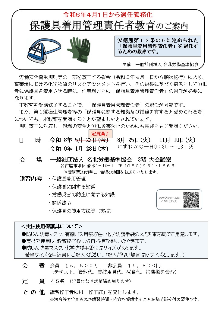 保護具着用管理責任者教育 開催のご案内