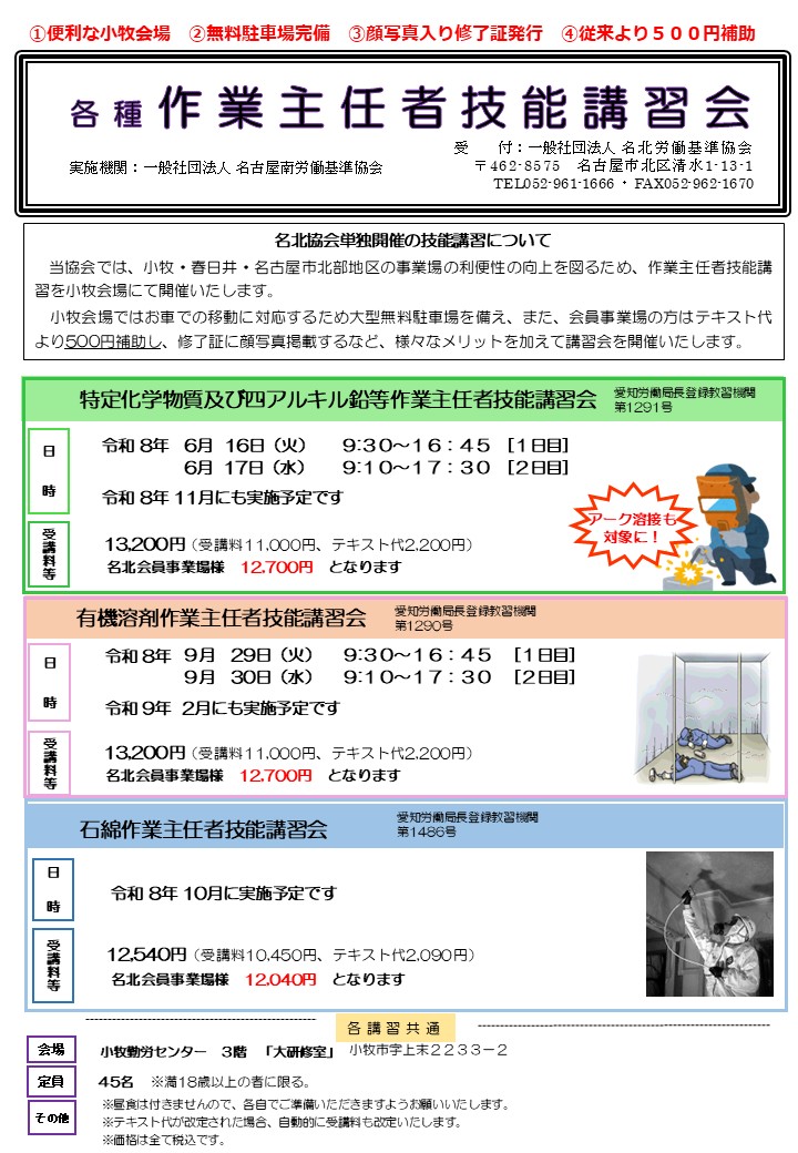 そこで、当協会では下記日程にて「有機溶剤作業主任者技能講習」を開催いたしますので、この業務に該当する労働者に、是非ともご受講いただきますようご案内いたします。