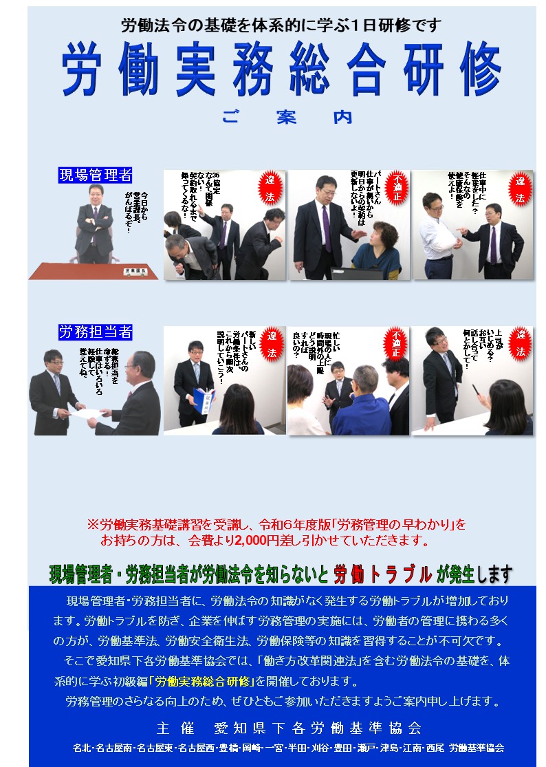 そこで、愛知県下の各労働基準協会では、労働者を使用される立場にある方等に最低限必要となる、関係法令とトラブル防止の基礎知識を学んでいただく「労働実務総合研修」を開催いたします。